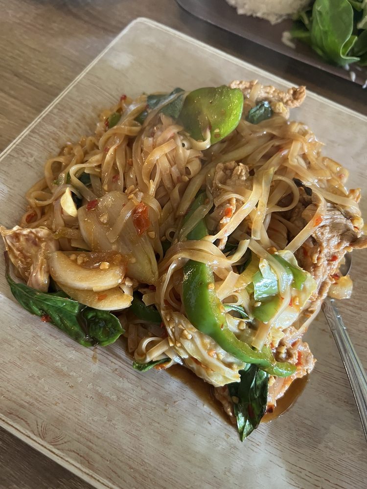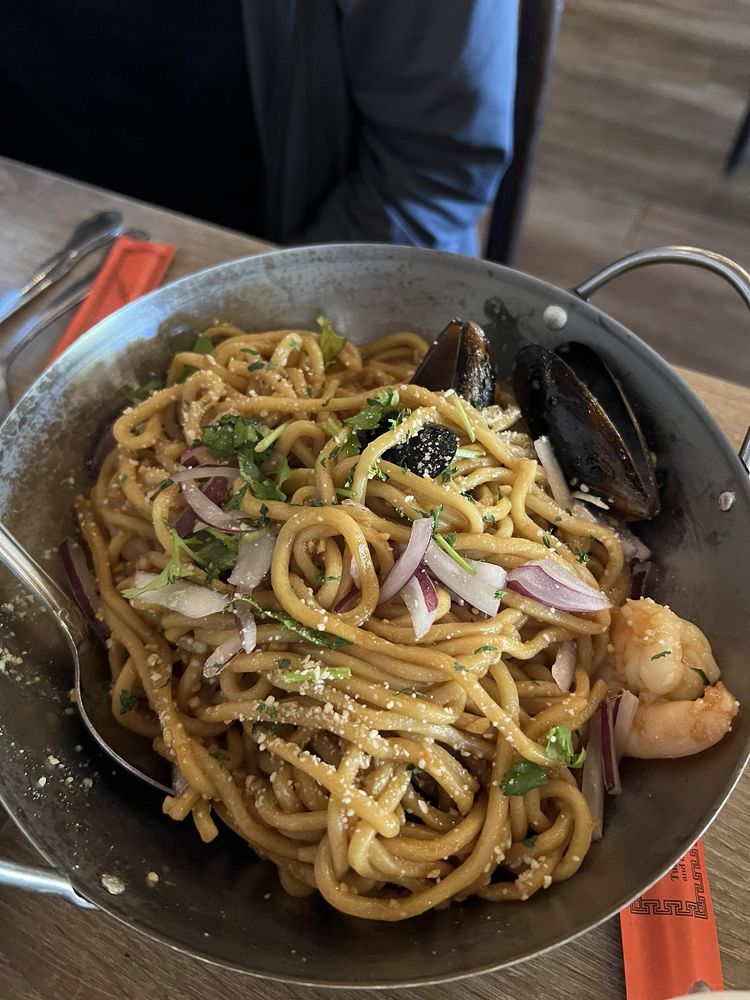 Stir-fried, egg noodle, seafood (Prawn. Mussel), garlic, green onion, Thai garlic sauce, and a hint of Parmesan.
